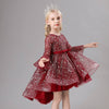Ein rotes Weihnachtskleid für Mädchen mit einem Unterrock aus zwei Schichten, eine aus Baumwollchiffon und eine darüber liegende aus einem Stoff, der mit Perlen und funkelnden weißen Sternen verziert ist. Das ist alles, was wir Ihnen zu dieser wunderbaren festlichen Kinderkleidung für Mädchen anbieten.