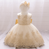 Ein Kleid, das klassische Eleganz mit königlichen Details verbindet. In einem subtilen Elfenbeinton ist der Stoff voller goldener Muster, die einen leuchtenden, fast märchenhaften Touch verleihen. Der ausgestellte Tüllrock öffnet sich sanft und gibt den Blick auf handgefertigte Stickereien frei. Ein passendes Haarband mit Satinschleife rundet diesen außergewöhnlichen Look ab.